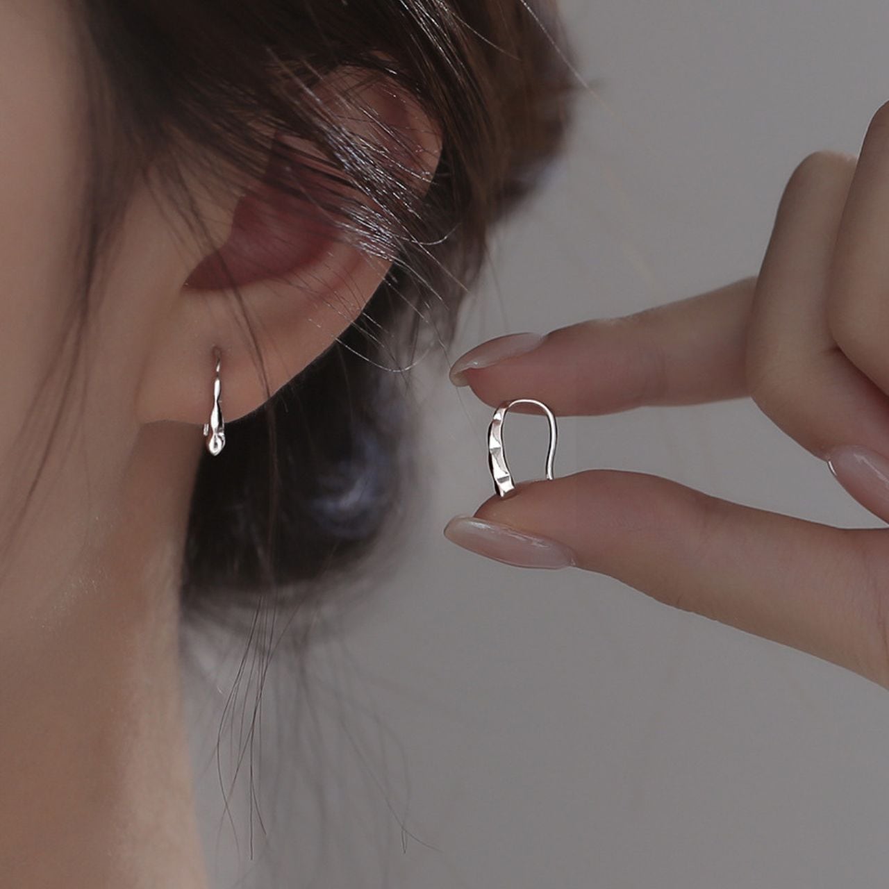 ※引っ掛けてフックピアスのようにも、先を耳たぶ側に上げてラインピアスとしても活用できる2Way仕様